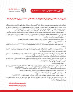 شرکت پاریز پیشرو صنعت توسعه در نظر دارد “تأمین یک دستگاه بیل بکهو با راننده و یک دستگاه تانکر ۱۳۰۰۰ لیتری به همراه راننده” خود را از طریق برگزاری مناقصه عمومی در بین اشخاص حقیقی و حقوقی واجد شرایط در سطح استان کرمان، فارس و شهرستان سیرجان واگذار نماید.