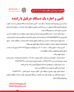 شرکت پاریز پیشرو صنعت توسعه در نظر دارد “تأمین و اجاره یک دستگاه جرثقیل با راننده” خود را از طریق برگزاری مناقصه عمومی در بین اشخاص حقیقی و حقوقی واجد شرایط در سطح استان کرمان، فارس و شهرستان سیرجان واگذار نماید.