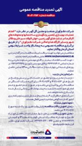 – زمان تحویل پاکات مناقصه: پایان وقت اداری روز یک شنبه مورخ ۱۴۰۴/۰۸/۱۸ میباشد.