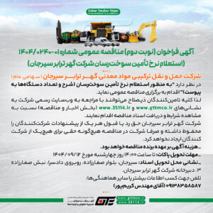 – نشانی محل تحویل اسناد: سیرجان، بلوار صفارزاده، روبروی، دادسرا، نبش صفارزاده ۳، دبیرخانه شرکت گهر ترابر سیرجان.