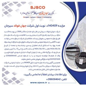 همچنین آگهی و اسناد مزایده نوبت اول 140409د در سایت اینترنتی شرکت جهان فولاد سیرجان به آدرس sjsco.ir پرتال فروش و مشتریان، قسمت مزایدهها، مزایدههای داخلی قابل مشاهده میباشد.