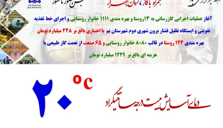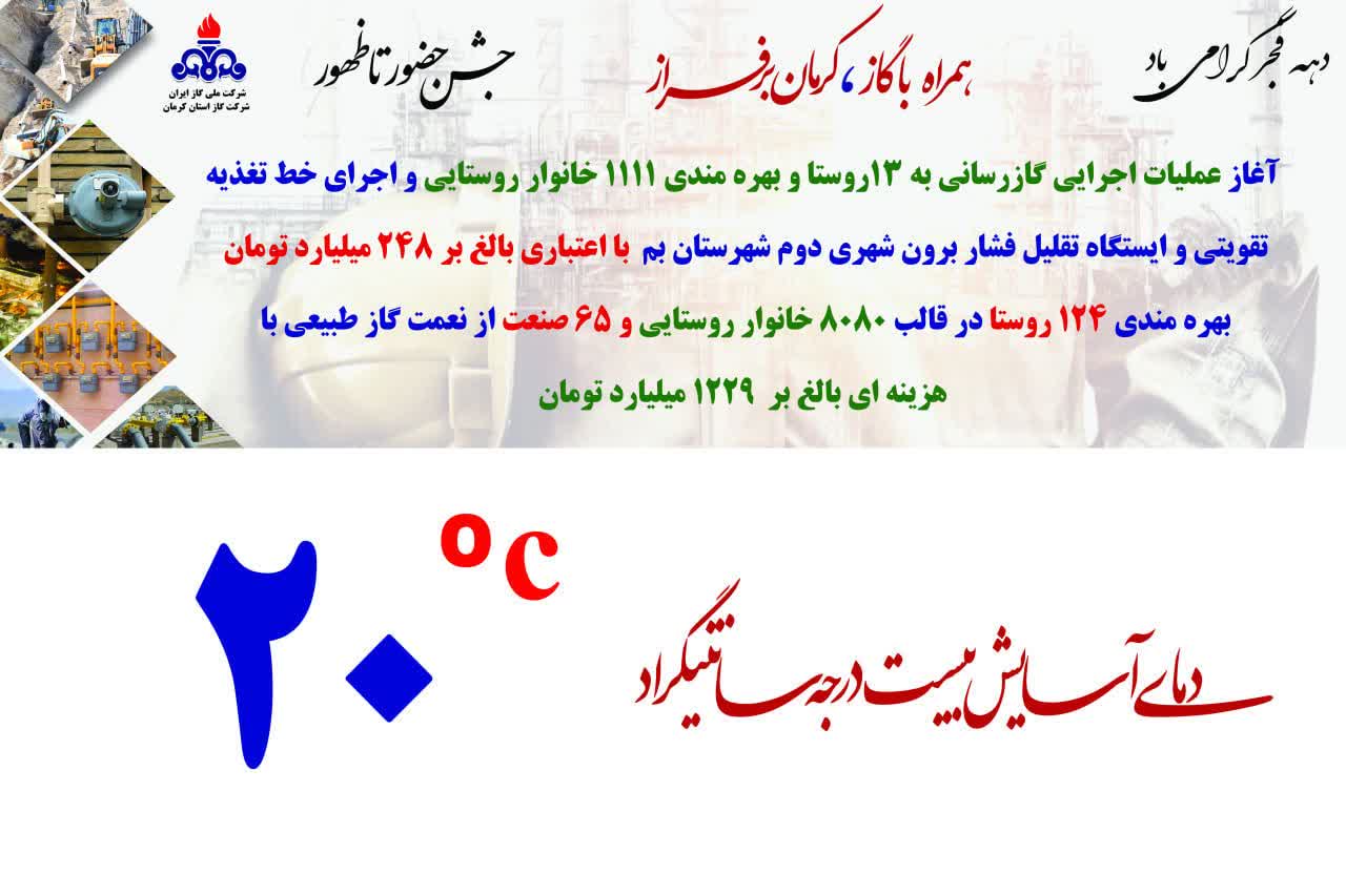 آغاز عملیات اجرایی گازرسانی به ۱۳ روستا و بهره‌مندی ۱۱۱۱ خانوار روستایی و اجرای خط تغذیه تقویتی و ایستگاه تقلیل فشار برون‌شهری دوم شهرستان بم با اعتباری بالغ بر ۲۴۸ میلیارد تومان بهره‌مندی ۱۲۴ روستا در قالب ۸۰۸۰ خانوار روستایی و ۶۵ صنعت از نعمت گاز طبیعی با هزینه‌ای بالغ بر ۱۲۲۹ میلیارد تومان