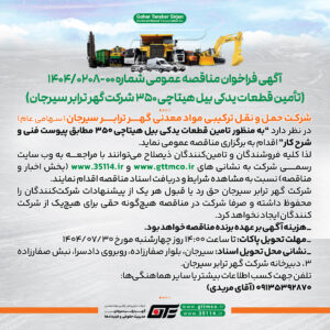 آگهی فراخوان مناقصه عمومی شماره ۰۰-۱۴۰۴/۰۲۰۸ (تأمین قطعات یدکی بیل هیتاچی ۳۵۰ شرکت گهر ترابر سیرجان)