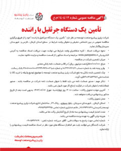 شرکت پاریز پیشرو صنعت توسعه در نظر دارد “تأمین یک دستگاه جرثقیل با راننده” خود را از طریق برگزاری مناقصه عمومی در بین اشخاص حقیقی و حقوقی واجد شرایط در سطح استان کرمان، فارس و شهرستان سیرجان واگذار نماید.
