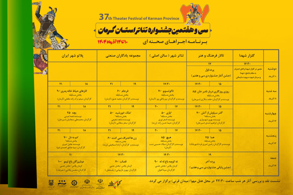 برنامه اجراهای بخش صحنهای و خیابانی سی و هفتمین جشنواره تئاتر استان کرمان که از دهم تا چهاردهم آذرماه ۱۴۰۴ در شهر کرمان برگزار میشود، اعلام شد.