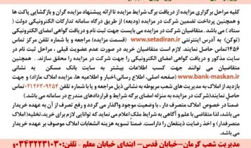 بانک مسکن در نظر دارد املاک غیرضرور خود واقع در استان کرمان را از طریق برگزاری مزایده عمومی و با شرایط نقد و یا نقد و اقساط (با نرخ سود٪۲۳ در قالب عقد اجارهبهشرطتملیک) که الویت با… ادامه مطلب ...